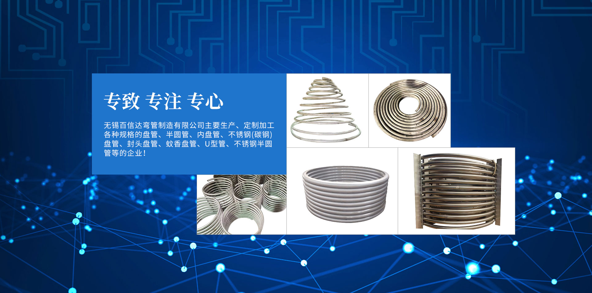無錫百信達彎管制造有限公司位于經濟發達、風景秀麗的太湖之濱。本公司擁有完整、科學的質量管理體系,公司的誠信、實力和產品質量獲得業界的認可。公司專注生產、定制加工各種規格的盤管、半圓管、內盤管、不銹鋼盤管、封頭盤管、蚊香盤管、U型管、不銹鋼半圓管、碳鋼盤管等的企業。本公司設計加工的彎管設備,質量精良、結構合理,效率高、操作簡易、經久耐用。公司已經承接了各地多個大型場館工程項目的彎管加工,屢次得到了多家大客戶的好評。努力滿足客戶的需要,不斷提高自身水平是公司追求的目標。歡迎社會各界朋友蒞臨無錫百信達彎管制造有限公司參觀、指導和業務洽談!